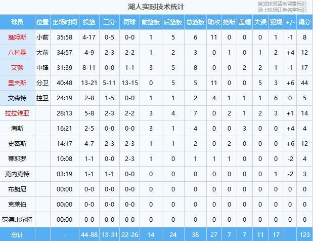 里夫斯44分5板11助、艾顿17分8板2帽、拉拉维亚14分7板2断、八村塁12分3板、史密斯12分2板2断、詹姆斯8分6板11助、文森特5分2板4助、海斯4分4板3帽、蒂耶罗4分1板1助、克内克特3分
